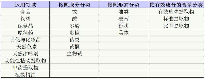中药提取原料药:是特指从传统中药材或天然植物中提取分离而得到的,具有明确的药物活性成分,含量达到90%以上的单一有效成分,具有药品批准文号,可作为中药制剂的原料;以及以中药或天然植物为原料,提取分离后制备而成的,可作为化药制剂原料的主要产品有:青篙素、紫杉醇、喜树碱。